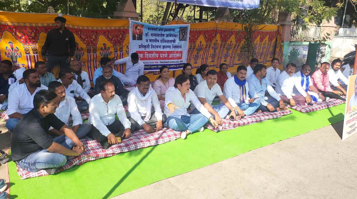 परभणी येथे १० डिसेंबर रोजी एका समाजकंटकाने डॉक्टर बाबासाहेब आंबेडकर यांच्या पुतळ्यासमोर उभारण्यात आलेल्या संविधान पुस्तिकेच्या प्रतिकृतीची विटंबना केल्याची घटना घडली होती. या घटनेचा निषेध व्यक्त करण्यासाठी परभणी येथे संविधान प्रेमी नागरिकांनी सनदशीर मार्गाने केलेले आंदोलन चिरडून टाकण्याचा संतापजनक प्रकार पोलीस विभागाने केला आहे.तसेच परभणी शहरात कोंबिंग ऑपरेशनच्या नावाखाली अनेक निरपराध तरुणांची धरपकड करून त्यांना अत्यंत अमानुष पद्धतीने पोलिसांनी मारहाण केली असून पोलिसांनी केलेल्या मारहाणीत विधी शाखेचा विद्यार्थी सोमनाथ व्यंकट सूर्यवंशी याचा मृत्यू झाला आहे.त्याच्या शवविच्छेदन अहवालात त्याच्या शरीरावर अनेक जखमा आढळून आल्या असल्याचा रोप आंबेडकरी अनुयायी करत असून याचे पडसाद संपूर्ण राज्यभर उमटत आहेत. जळगाव शहरात आज दिनांक मंगळवार दिनांक १७ डिसेंबर रोजी जिल्हाधिकारी कार्यालयासमोर शहरातील संविधान प्रेमी विविध संघटना व समाज बांधवांच्या वतीने एक दिवसीय धरणे आंदोलन करून संविधान विटंबना घटनेचा निषेध व्यक्त करत महायुती शासनाच्या विरोधात रोष व्यक्त करण्यात आला.