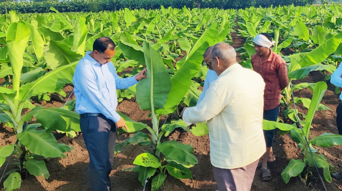 जिल्हाधिकारी आयुष प्रसाद यांनी फैजपूर (ता.यावल) परिसरातील केळी पिकावरील कुकुम्बर मोझॅक व्हायरस (सी. एम. व्ही.) बाधीत क्षेत्राची आज पाहणी केली. त्यावेळी ते बोलत होते. या भेटीत त्यांनी शेतकऱ्यांबरोबर चर्चा केली व सी. एम. व्ही. चे प्रभावीपणे नियंत्रण करण्यासाठी शेतकऱ्यांना येणाऱ्या अडचणी समजून घेतल्या.