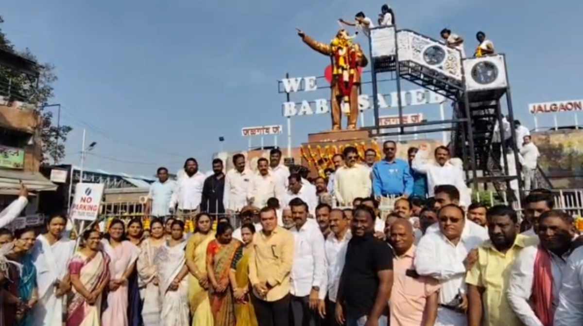 जळगाव । आज डॉ. बाबासाहेब आंबेडकर यांचा ६९वा महापरिनिर्वाण दिन आहे. यानिमित्त जळगाव रेल्वे स्थानकाजवळील डॉ. बाबासाहेब आंबेडकर यांच्या पुतळ्यास अभिवादन करण्यासाठी भीम अनुयायी यांची मोठी उपस्थिती होती. यावेळी जळगाव शहराचे आमदार सुरेश भोळे महानगरपालिका आयुक्त ज्ञानेश्वर ढेरे यांच्या हस्ते माल्याअर्पण करण्यात आले.