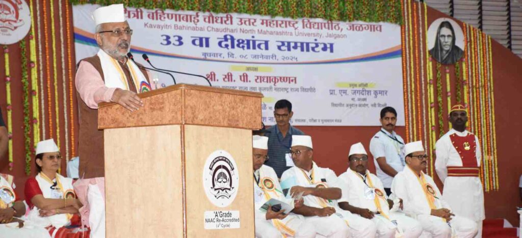 जळगाव | उच्च शिक्षणातील सकल नोंदणीचे प्रमाण पुढील दहा वर्षात ५० टक्क्यांपर्यत वाढविण्याचा निर्धार करण्यात आला असून त्यासाठी शिक्षणक्षेत्रातील सर्व घटकांवर मोठी जबाबदारी येऊन पडली आहे. नवीन राष्ट्रीय शैक्षणिक धेारणाच्या माध्यमातून हा निर्धार पूर्ण करण्यासाठी सामुहिक प्रयत्नांची गरज असल्याचे प्रतिपादन राज्यपाल तथा विद्यापीठाचे कुलपती श्री. सी.पी. राधाकृष्णन यांनी व्यक्त केला.